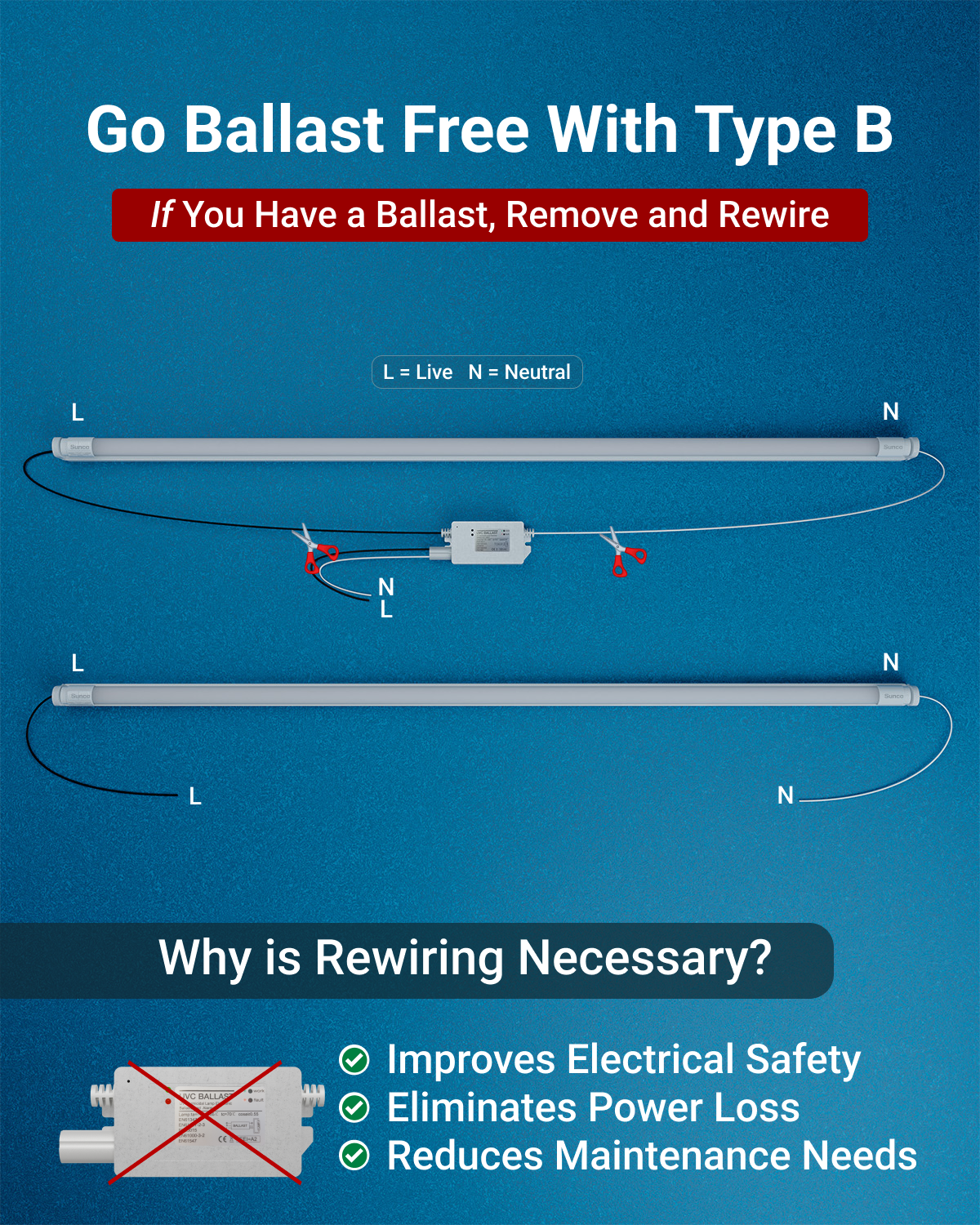 Prior to installing Type B tubes, all existing ballasts must be removed and the fixture rewired accordingly. Failure to do so may damage the lighting tube and create a serious fire hazard.