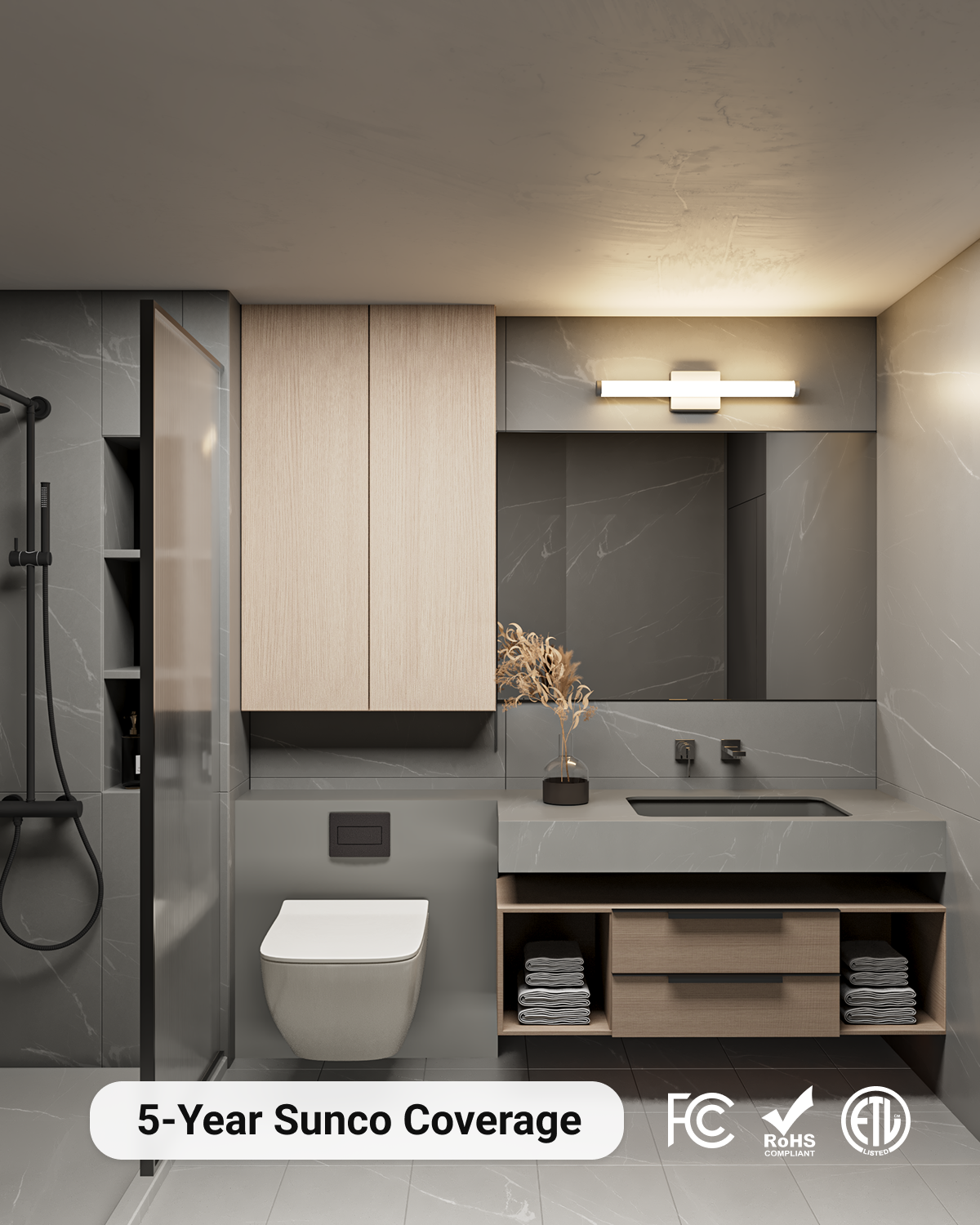We uphold the highest standards for all our products by testing each product for optimal performance and safety. This vanity light fixture is backed by ETL, FCC and RoHS certificates.