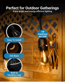 | 48ft Outdoor String Lights, 24 LED Filament Bulbs, Suspended Standard Sockets, 1800 Lumens Specifications