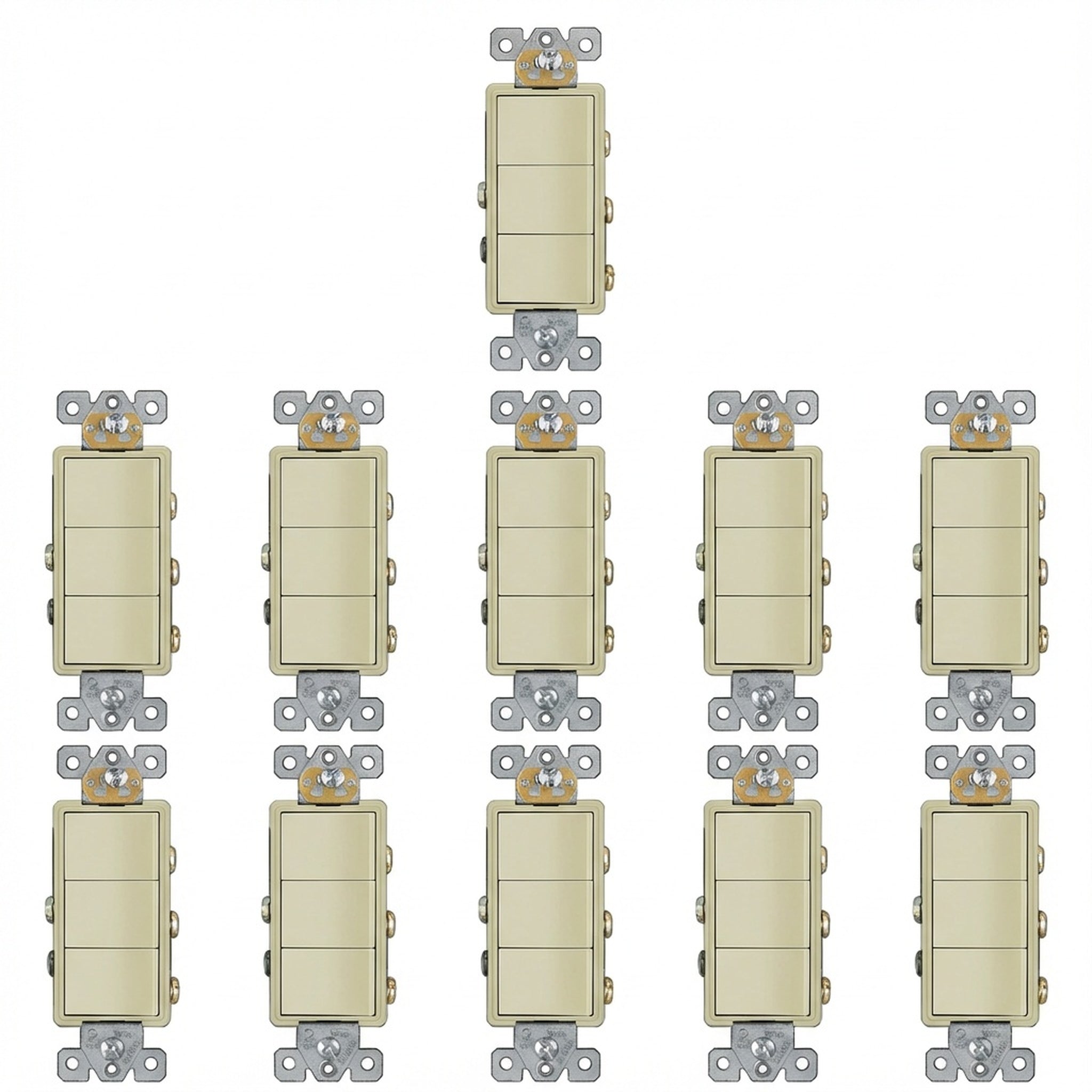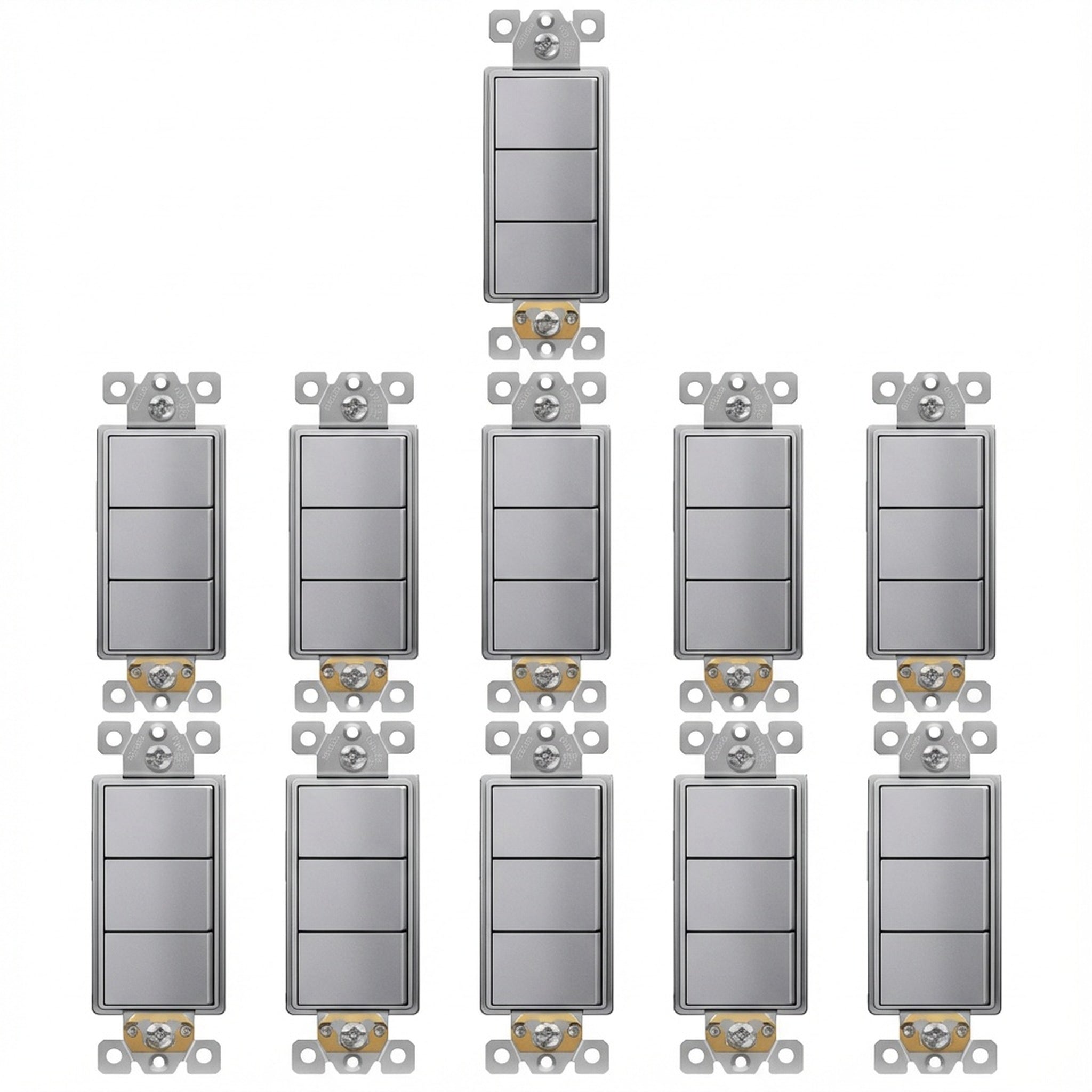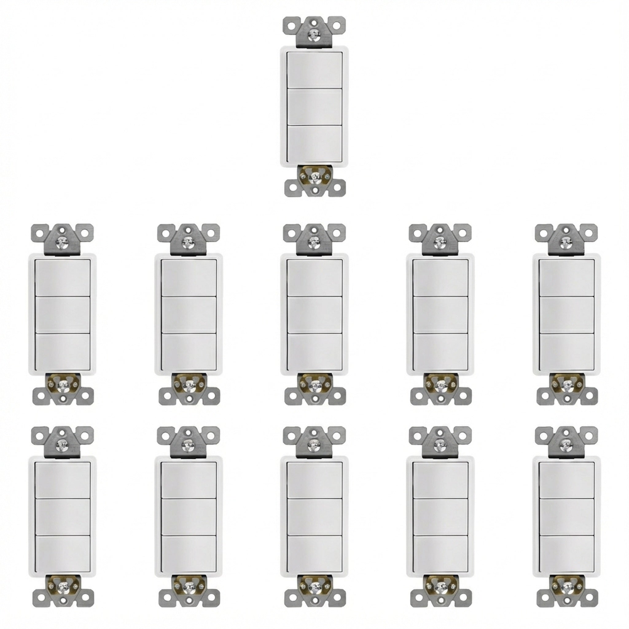 The ENERLITES 62755 Triple Rocker switch has an AC quiet switch feature, with terminal screws backed out and ready for wiring. This device is back wired only.