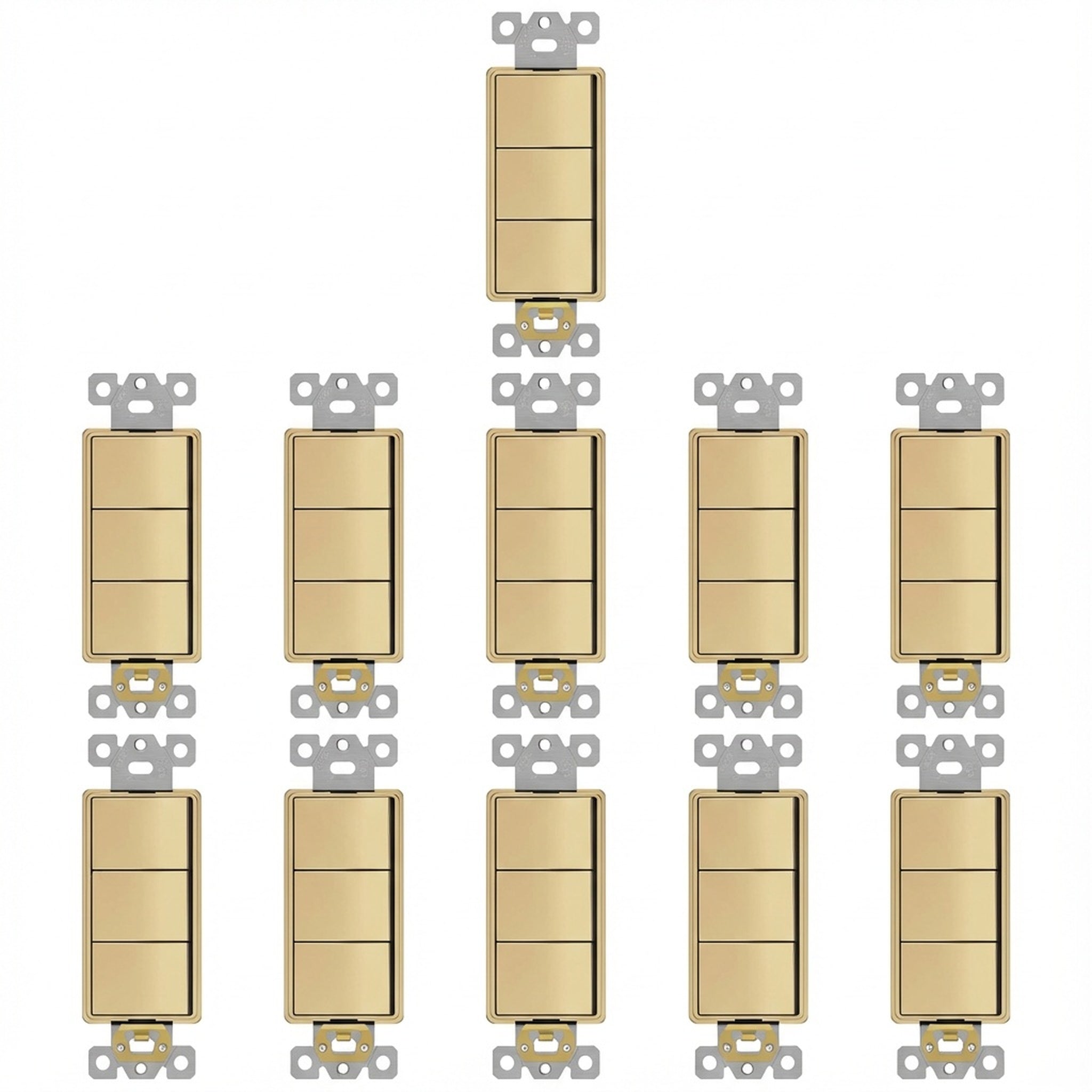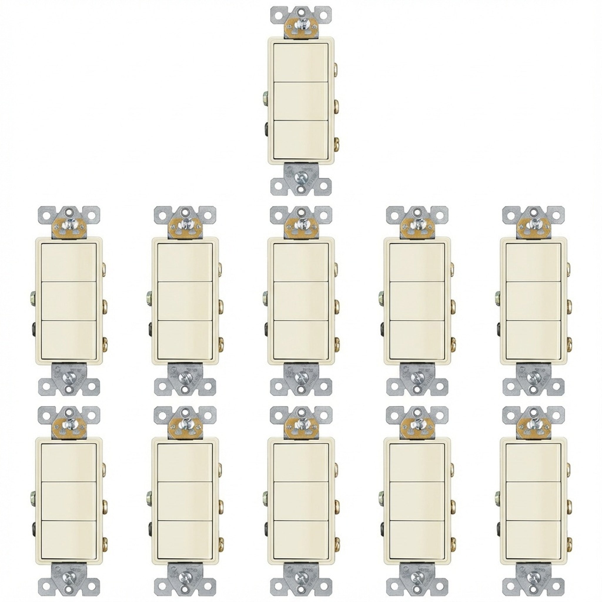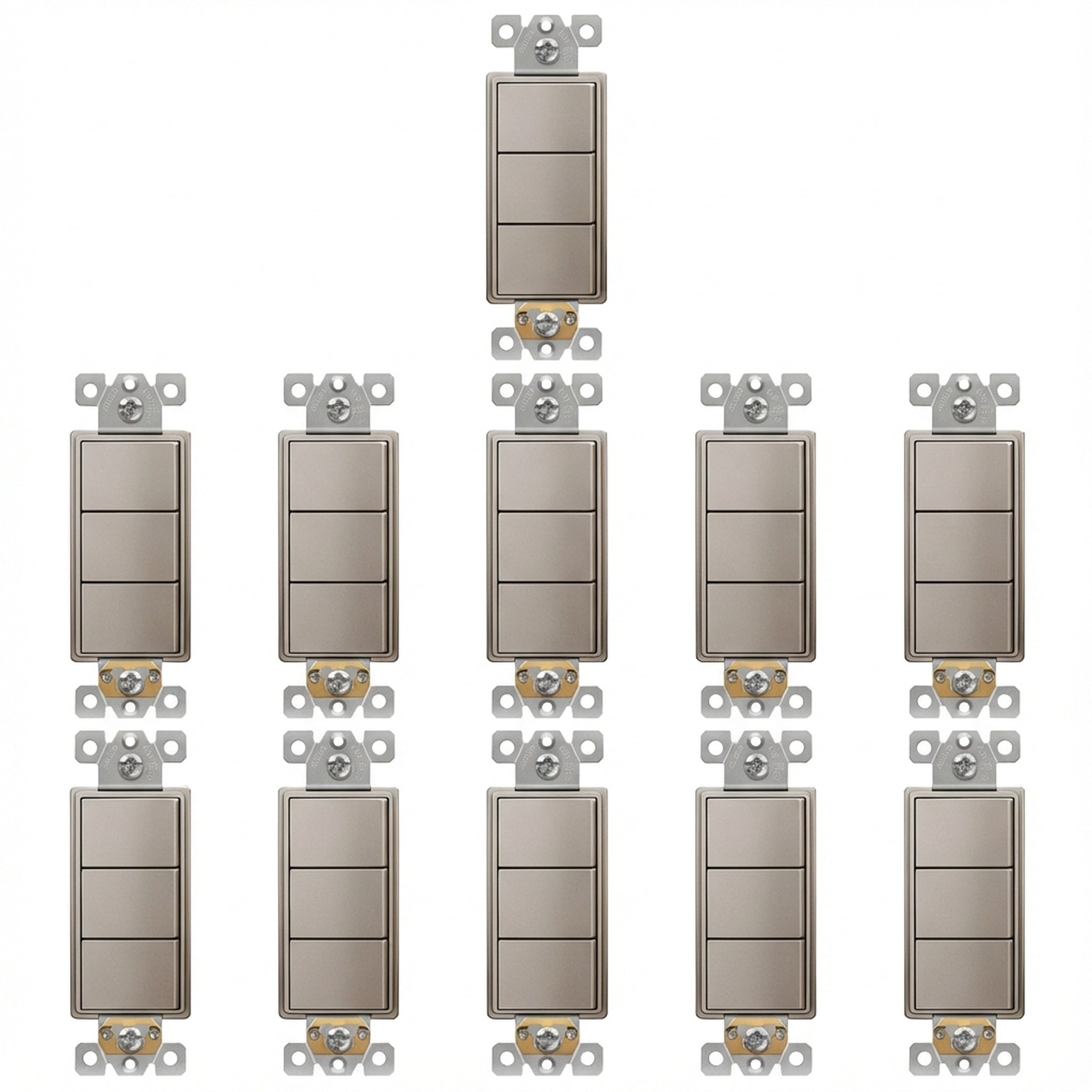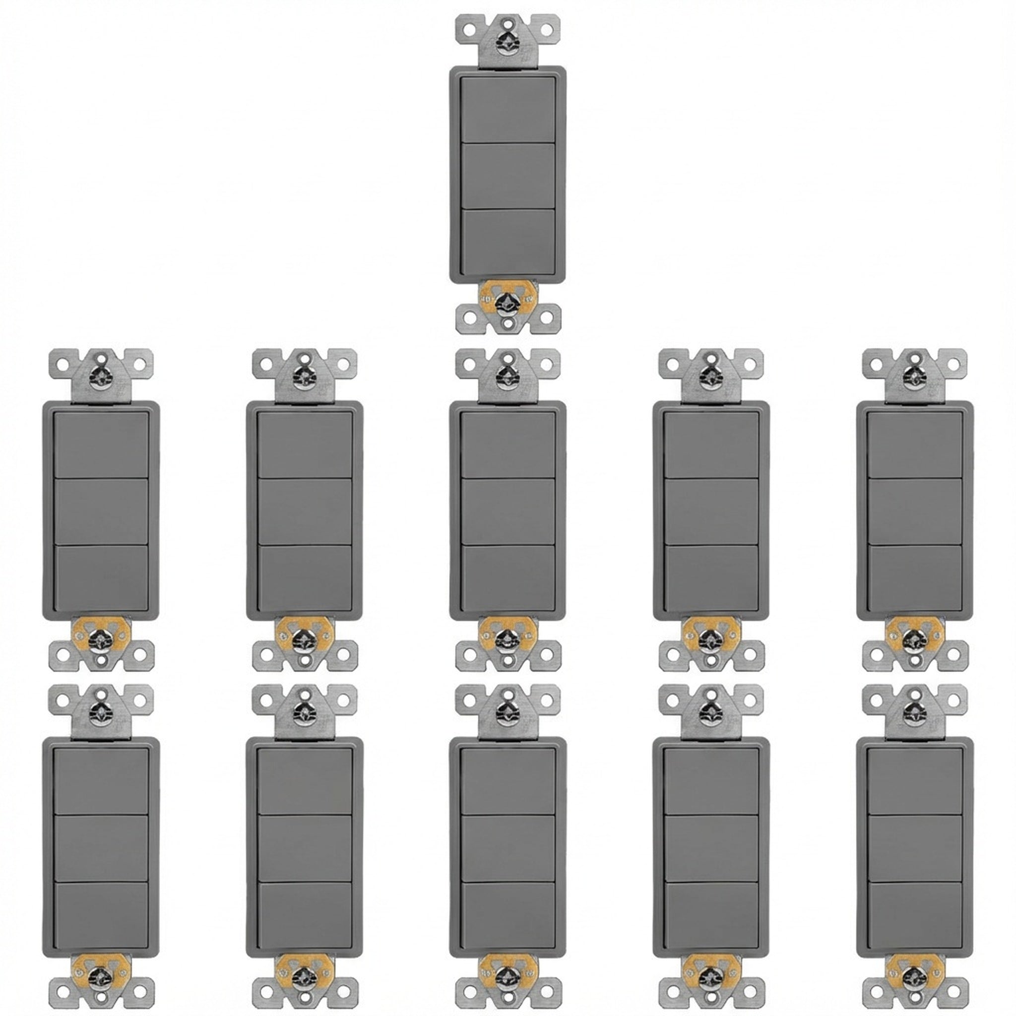 The ENERLITES 62755 Triple Rocker switch has an AC quiet switch feature, with terminal screws backed out and ready for wiring. This device is back wired only.