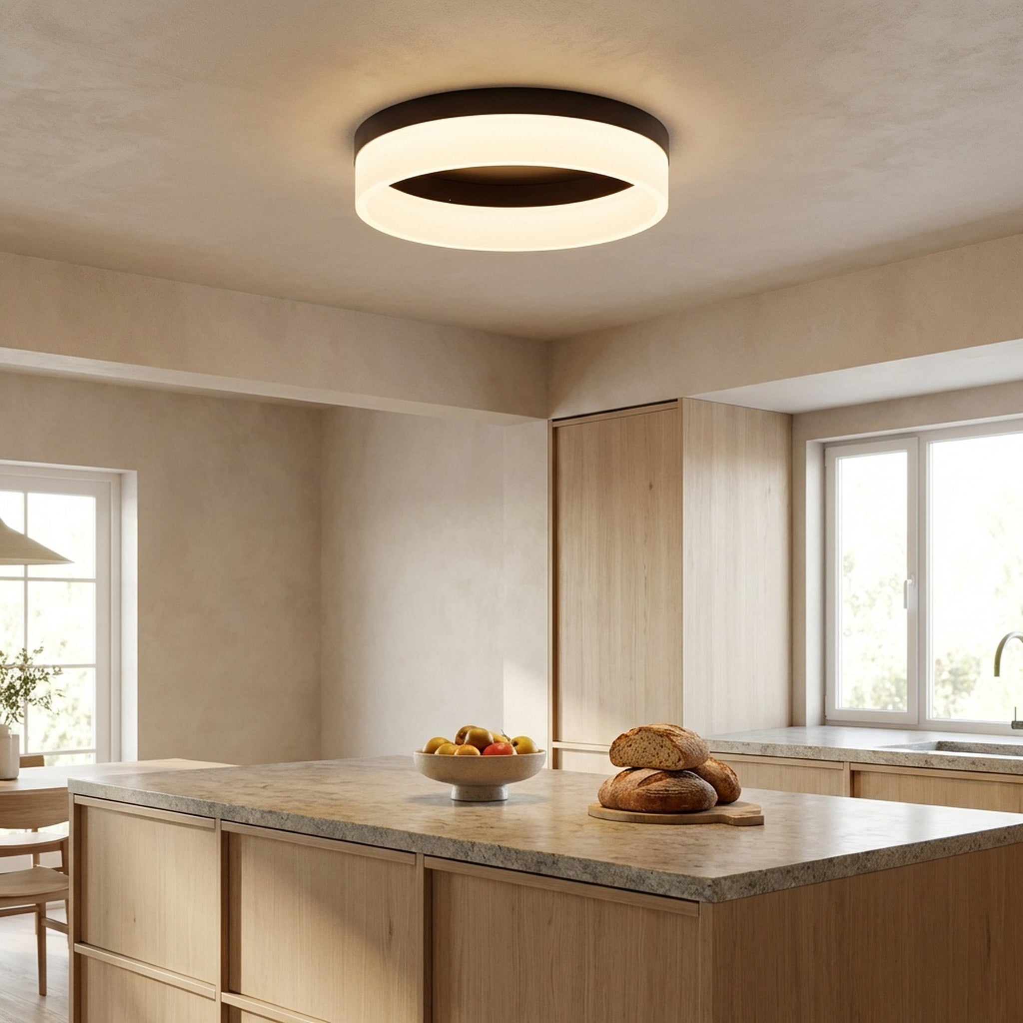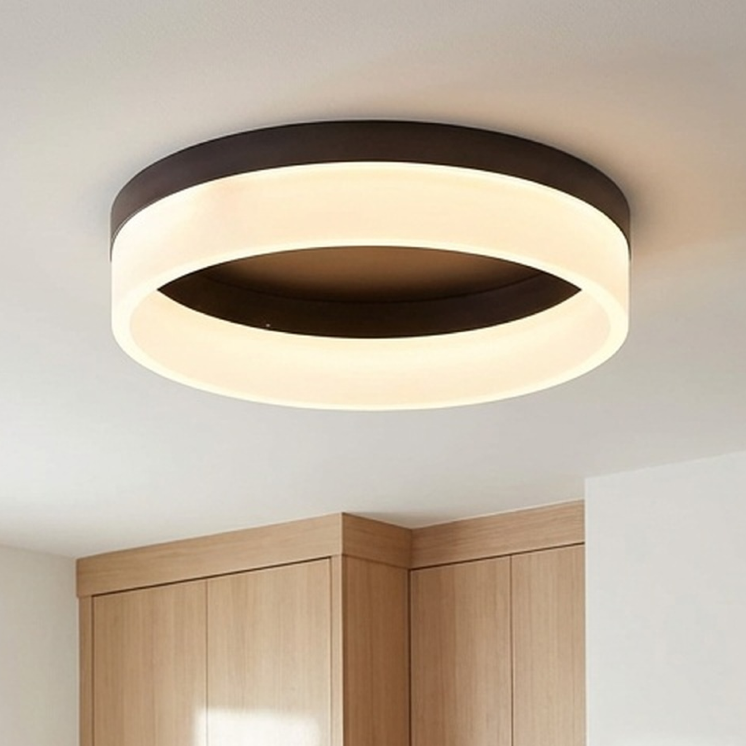 The round LED Ceiling Light fixture offers a chic touch to your home with its elegant yet understated design. This modern ceiling fixture features an acrylic shade and oil-rubbed bronze finish that gently diffuses light to minimize glare and create a cozy atmosphere. It is constructed with cold-rolled steel to ensure durability while maintaining a sleek and polished look. Available in three sizes—12", 16", and 20"—with brightness levels of up to 2,330 lumens, this surface-mount LED light is versatile and fits rooms of different sizes. Bask in the soothing glow of the 3000K warm white color temperature, perfect for creating a peaceful and relaxing ambiance.