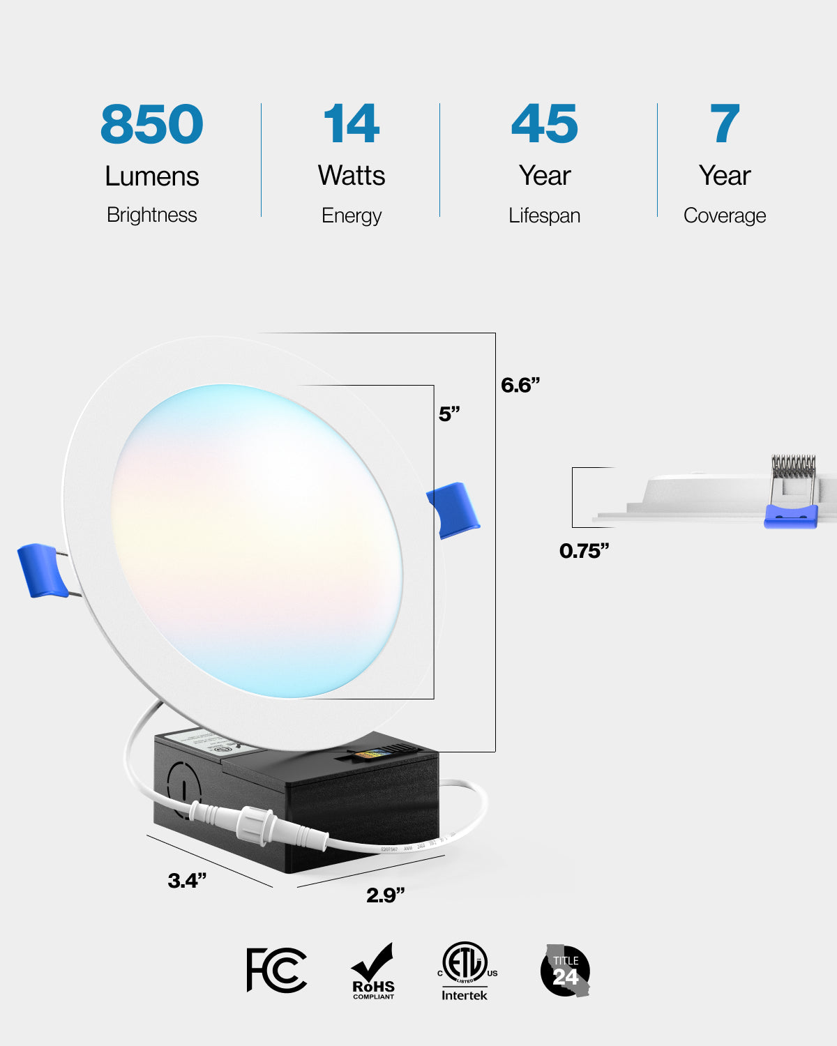 ● IC RATED - This 6” Slim LED downlight wafer thin slim with selectable CCT is IC rated, meaning the junction box is thermally protected and designed to be installed in the ceiling surrounded by insulation. With worry-free installation, our Slim recessed lights won't overheat and cause a fire in the roof or overhead joist space.