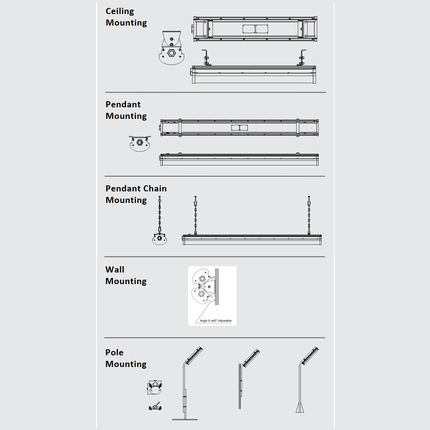 The 4-ft linear lighting fixture offers multiple mounting options including ceiling, surface, suspended, wall (with directional changes), and pole mounting, making installation fast and easy across a wide range of applications.