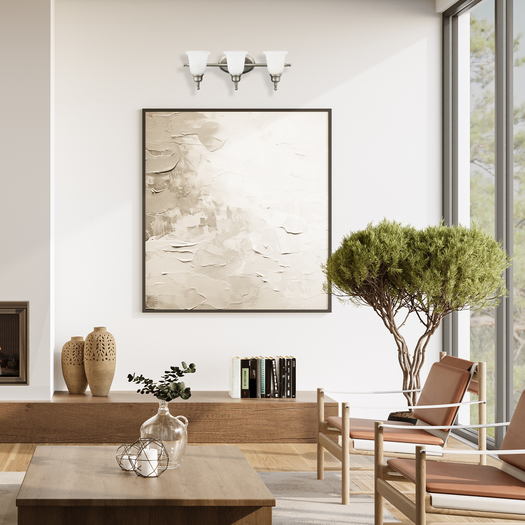 The 3-Light LED Vanity Light fixture adds ample illumination and a contemporary appeal to your bathroom or powder room. Made of durable steel with a satin nickel finish, this 24-inch wall light brings both style and long-lasting, energy-efficient performance. It features a clean oblong backplate and a horizontal arm that holds three bell-shaped alabaster glass shades. Each shade has a subtle frosted swirl that gently diffuses the LED light for a warm, welcoming glow. Versatile in design and easy to install, this decorative wall sconce offers customizable styling to suit your space.