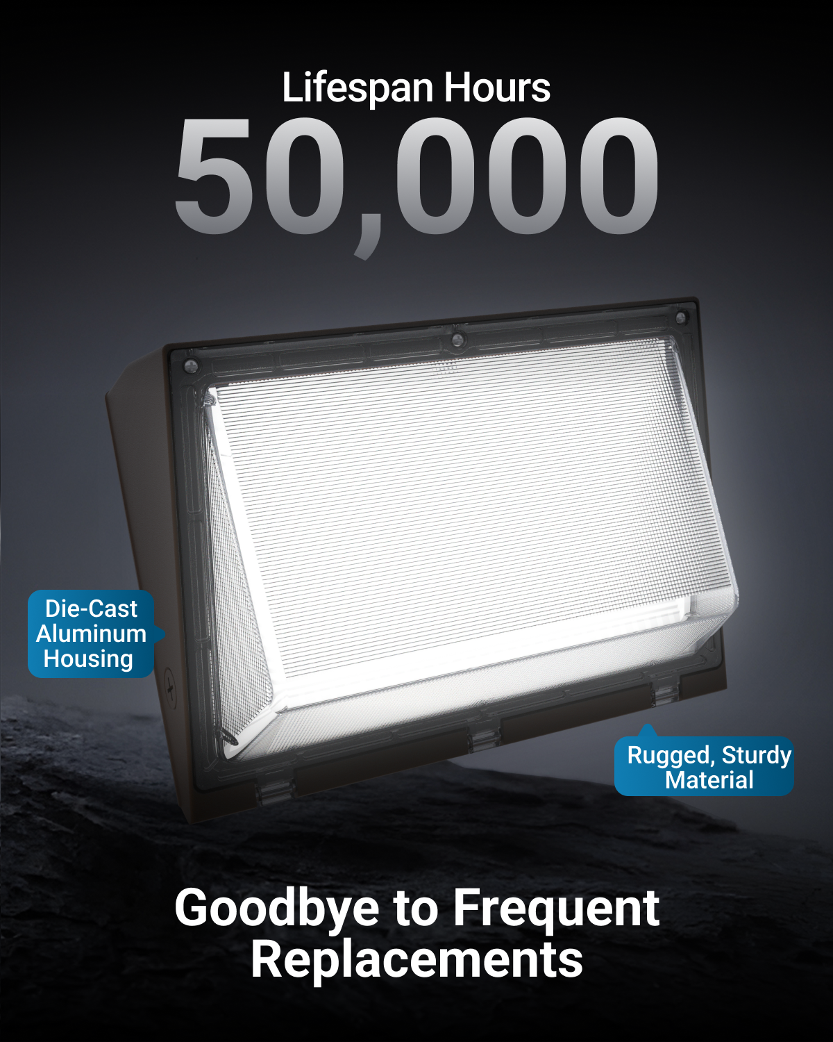 Made with durable aluminum alloy housing, our IP65-rated Wall Pack easily stands up to the elements. Ideal for outdoor spaces such as building exteriors, parking lots, street/alleyways, and garages.
