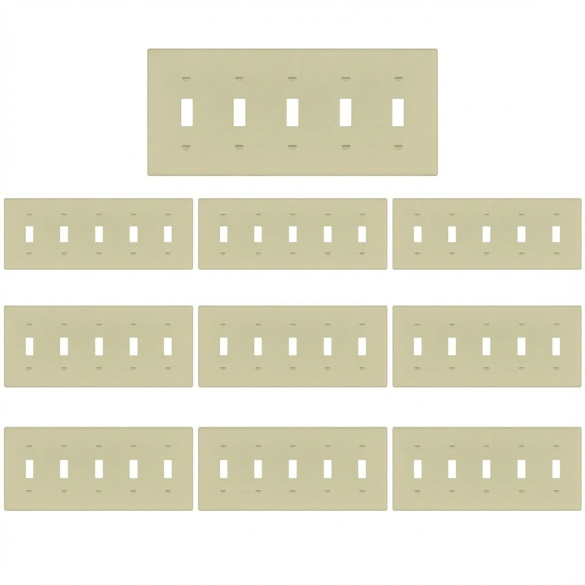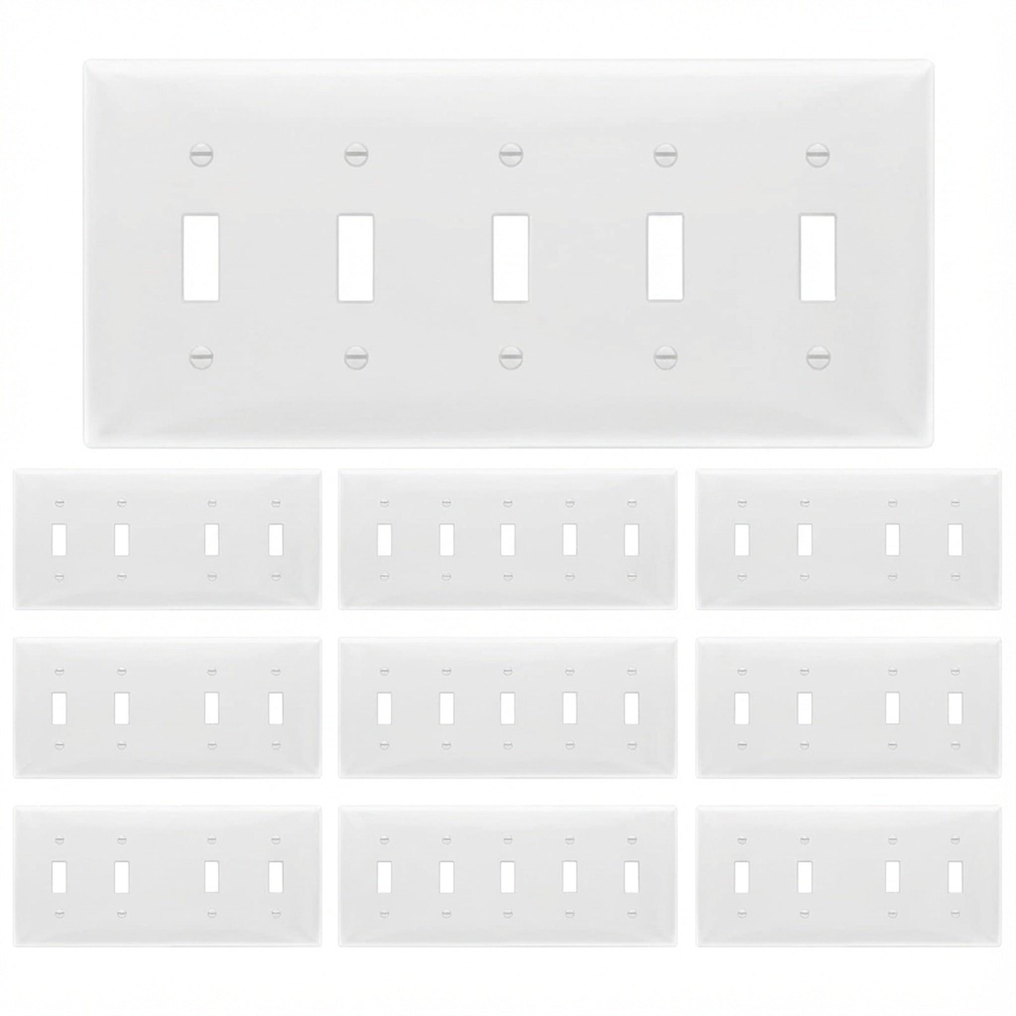 This is a 5-gang toggle wall plate. Enerlites polycarbonate thermoplastic wall plates are manufactured to provide durability, flexibility, and resilience to bending and high impacts. They are also heat and fade-resistant to temperatures over 100 degrees, which protects them from fading and discoloration over time, and have a flammability rating of UL94, V2. Their smooth finish provides an attractive look and makes them easy to clean.