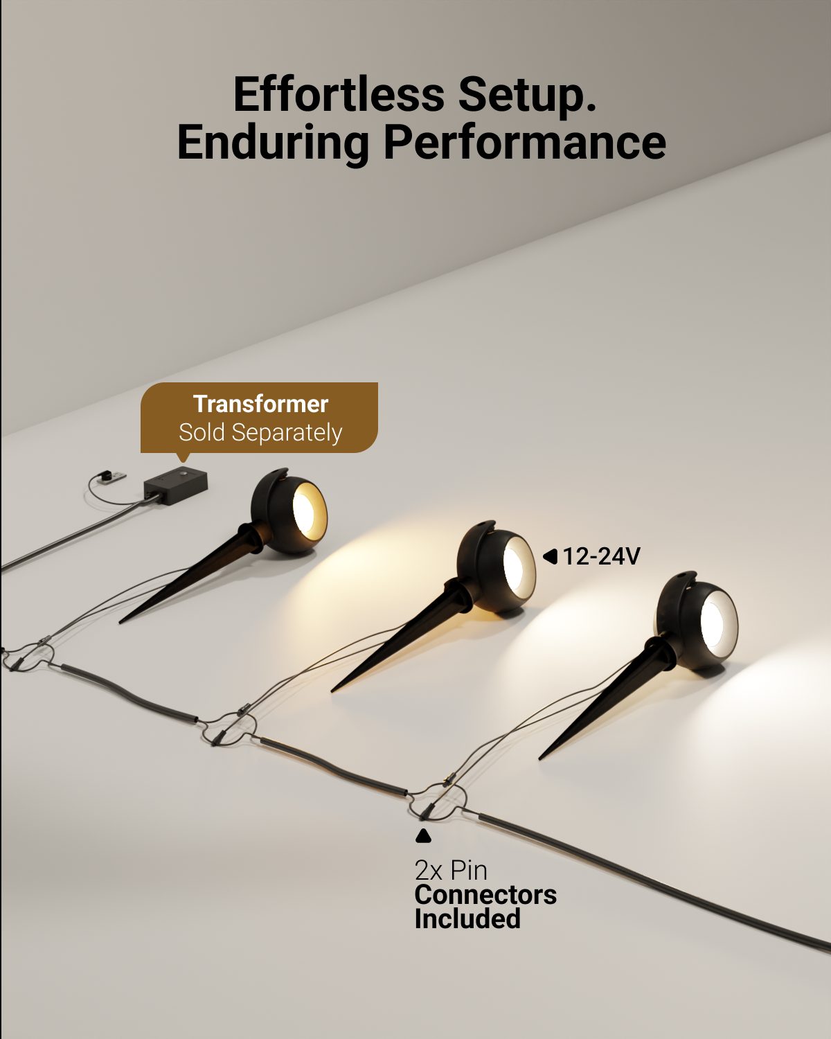 Includes ground stake and low-voltage wire connectors for quick setup. Connects to any 12–24 V transformer system for reliable outdoor illumination.