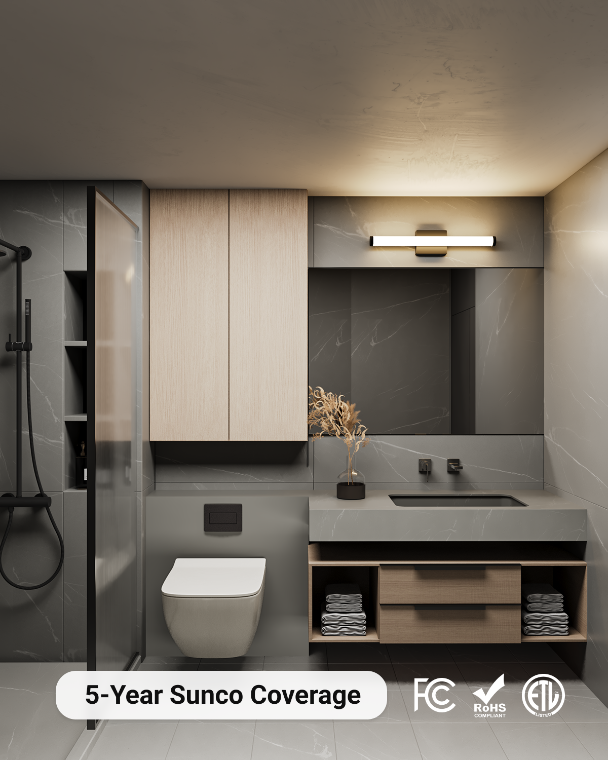 We uphold the highest standards for all our products by testing each product for optimal performance and safety. This vanity light fixture is backed by ETL, FCC and RoHS certificates.