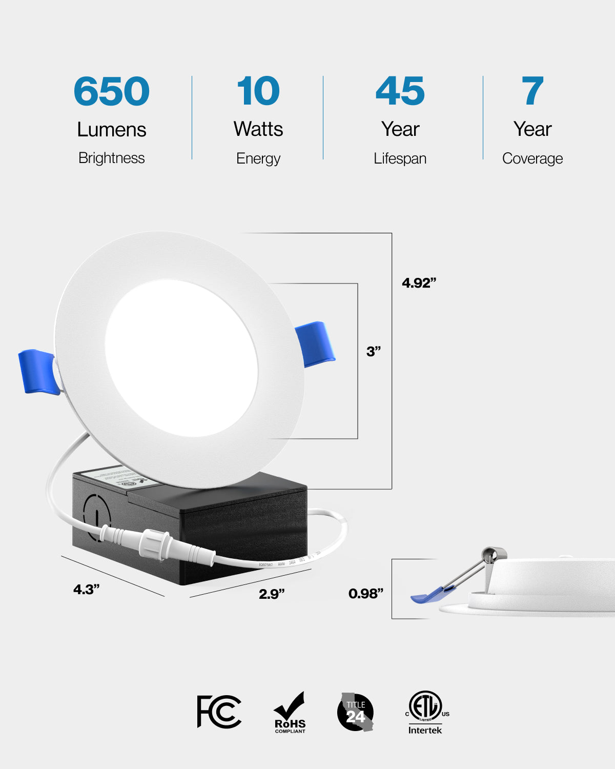 Recessed LED Lighting, 4 Inch, Slim, Wafer Thin, Smooth Trim, 650 Lumens Specifications