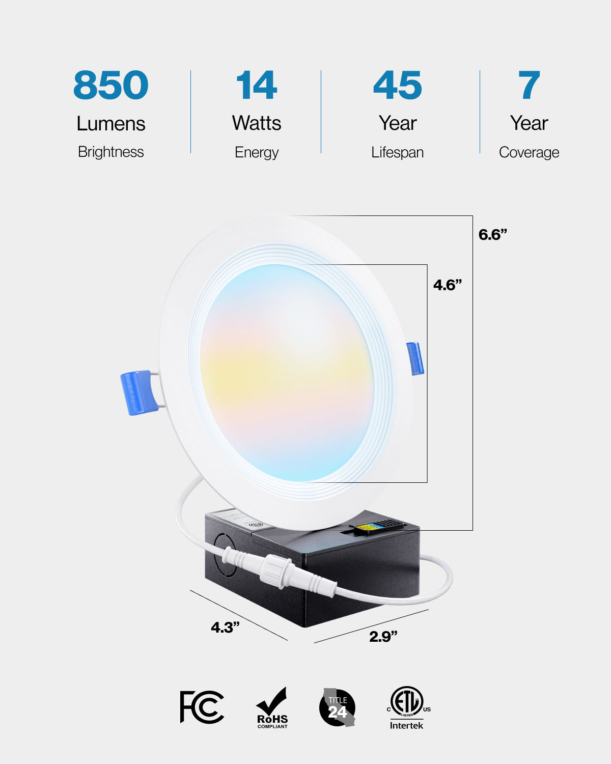 All in one package for easy install. Selectable color temperature. No can needed. IC rated for fire safety.