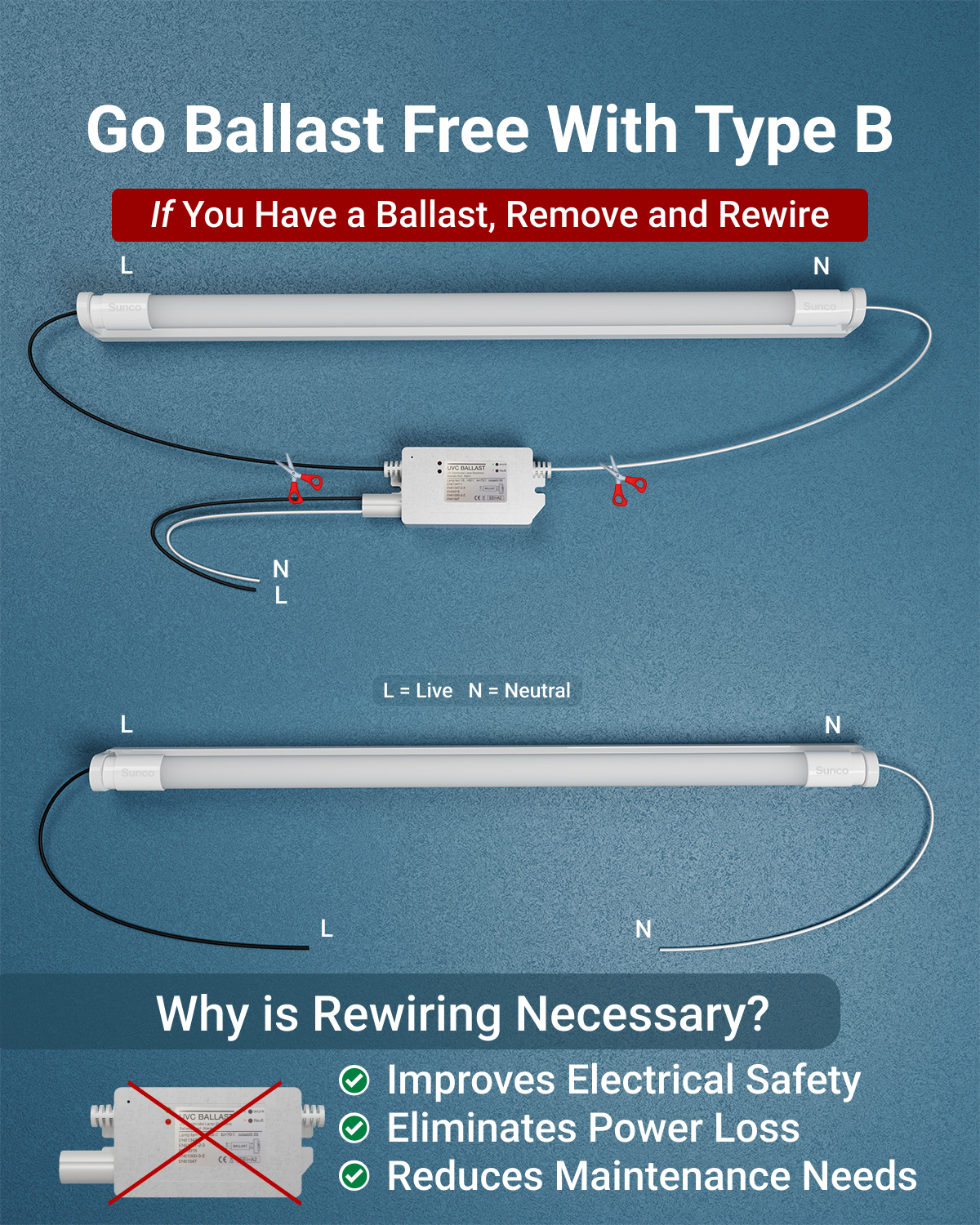 Prior to installing Type B tubes, all existing ballasts must be removed and the fixture rewired accordingly. Failure to do so may damage the lighting tube and create a serious fire hazard.